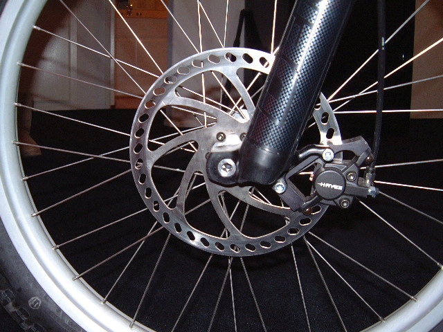 Marzocchi Monster T forks with 40mm hard anodized aluminum tubes, a 20 mm tubular axle and adjustable preload, compression and rebound dampening. The tiny Hayes hydraulic disk brakes have no master cylinders, but have stopping power that belies their incredibly light weight. If they look a little weak to you, don't be fooled, and remember, the whole bike weighs less than 140 pounds, about 30 pounds lighter than the average trials bike.