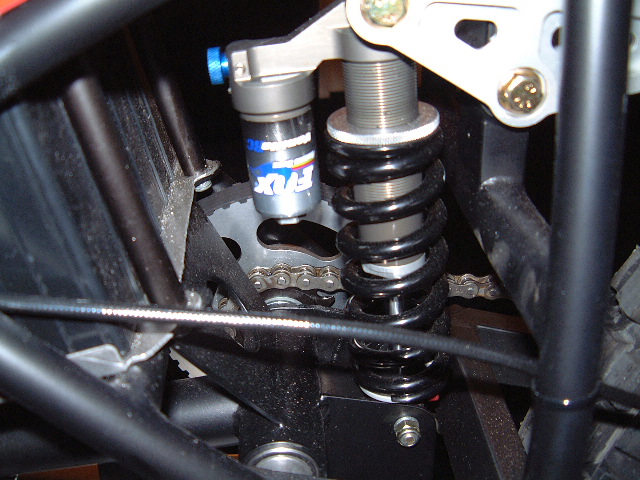 The swingarm pivot, primary belt drive, and final drive countersprocket all rotate on the same shaft, eliminating chain free play and the resulting driveline lash that normally reduces traction and control. Check out the trick Fox Vanilla RC shock and forged alloy rising rate suspension linkage!